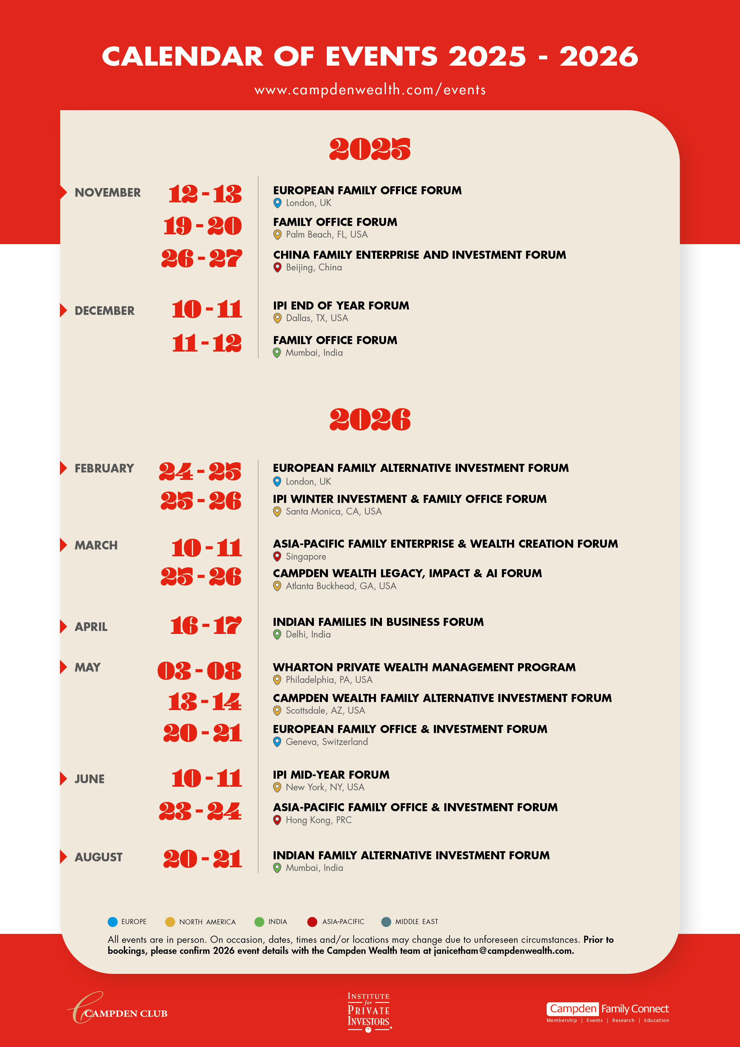 Celebrating its 20th anniversary, the flagship Family Office Forum explores all facets of family office management, including operations, governance, succession planning, investment structuring, and tax considerations. Attendees will discuss best practices for recruiting and retaining staff, determining which functions to handle in-house versus outsourcing, and navigating transitions. This forum offers a unique space to learn, exchange ideas, and form connections that will support family offices across generations. We’ll address common challenges and proactive solutions to thrive into 2026 and beyond.