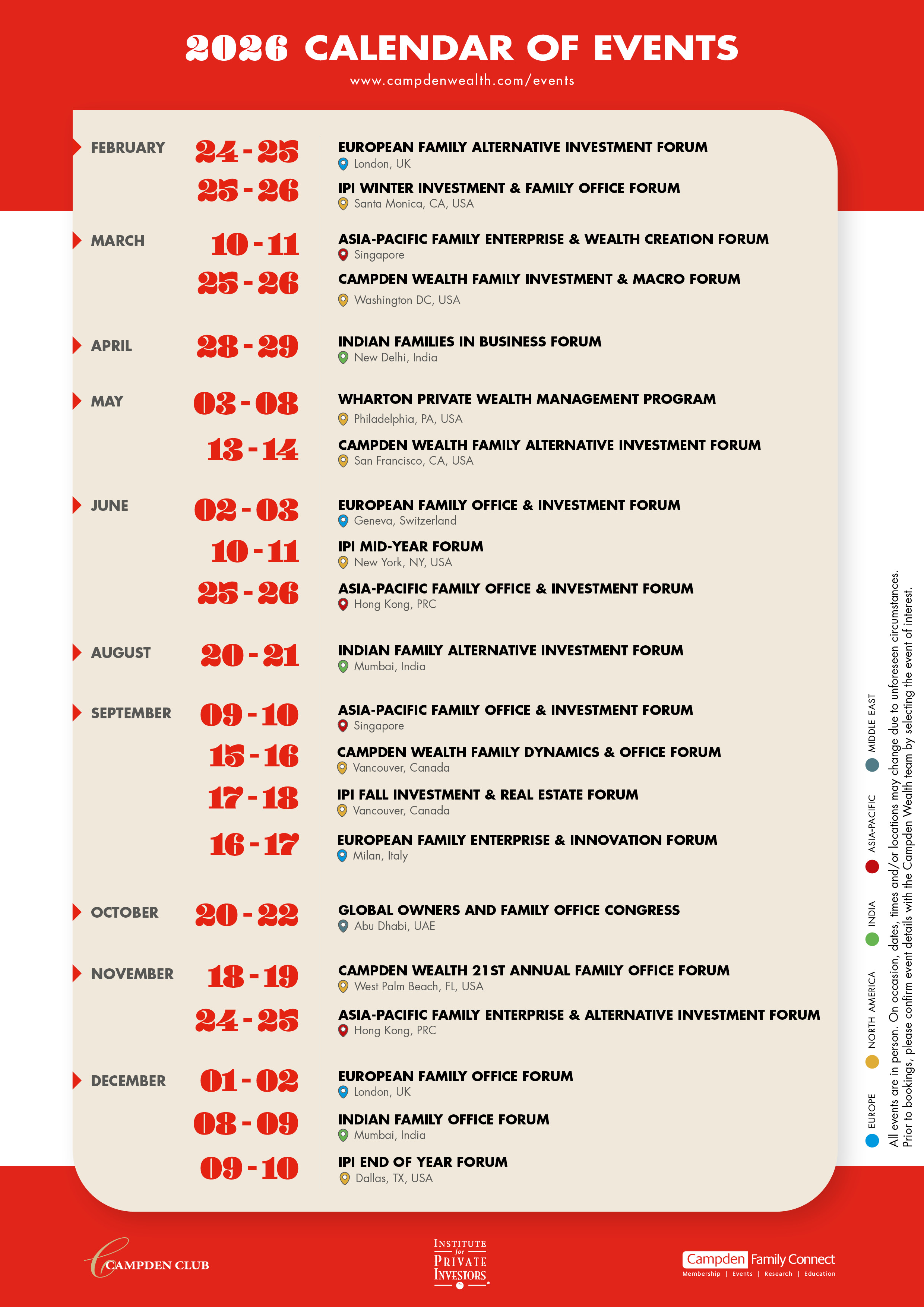 The 2026 Family Investment and Macro Forum convenes family offices and ultra-high-net-worth investors in our nation’s capital for a forward-looking examination of the forces shaping capital allocation and wealth preservation in the year ahead. Through family- and expert-led discussions on geopolitics, defense innovation, capital markets, artificial intelligence, public policy, national security, governance, and tax dynamics — alongside distinctive Washington insider perspectives — the forum delivers clarity amid uncertainty. Attendees will gain actionable takeaways on portfolio positioning, risk management, and long-term strategy, helping them understand how macro trends translate into real investment implications, how policy, regulatory, and technological shifts may influence portfolio construction, and where opportunities may emerge for private capital and multi-generational wealth.